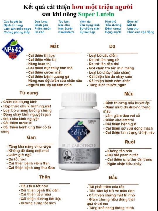 Lutein là một thành phần quan trọng trong nhiều loại thực phẩm chức năng, bao gồm cả sản phẩm Super Lutein từ Nhật Bản. Dưới đây là thông tin chi tiết về lutein và các tác dụng của Lutein: