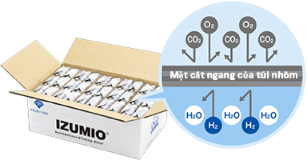 IZUMIO được đóng gói trong một túi nhôm gồm bốn lớp nhằm tăng tính bảo vệ cao nhất. Nghiên cứu và thử nghiệm đã được thực hiện để đảm bảo rằng nắp trên túi nhôm không bị rò rỉ ngay cả khi gói IZUMIO được úp ngược xuống trong thùng cũng như tỷ lệ phân giải hrydro cao của sản phẩm vẫn được giữ nguyên ngay cả khi lưu kho trong thời gian dài.