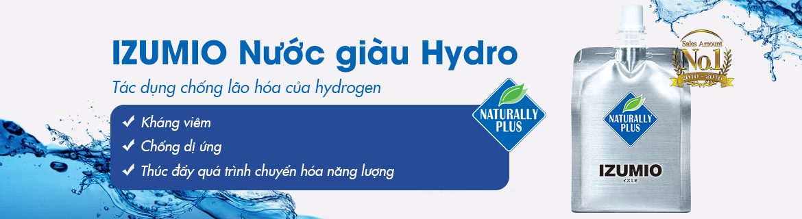 NƯỚC GIÀU HYDRO - IZUMIO-nước thần kỳ đến từ Nhật Bản chứa hydrogen hoạt tính có cụm phân tử nhỏ hơn nước thông thường. Điều đó có nghĩa nó chuyển hóa các vitamin, khoáng chất, và các chất dinh dưỡng quan trọng khác qua màng tế bào hiệu quả hơn. Việc hấp thụ tốt các phân tử nước đóng vai trò quan trọng trong việc điều trị các loại bệnh chuyển hóa, giúp nước làm hiệu quả nhiệm vụ thanh lọc cơ thể giải độc.