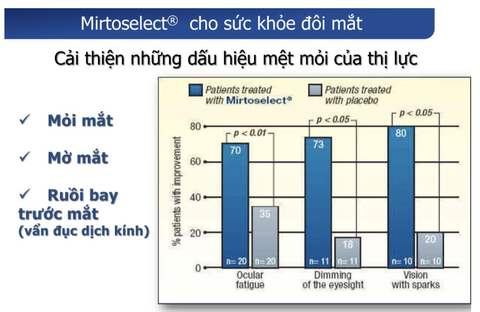 - Báo cáo lâm sàng đã chứng minh về Mirtoselect ™: Về những hỗ trợ giúp phục hồi thị lực do phải điều tiết mắt quá nhiều, các nhà y học thử nghiệm lâm sàng cho các đối tượng nghiên cứu sử dụng Mirtoselect