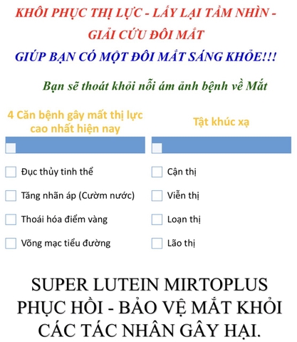 Super Lutein Mirtoplus giải pháp hồi sinh cho mắt không cần phẫu thuật , một giải pháp an toàn nhất cho việc phòng và ngăn ngừa hỗ trợ điều trị Thoái hóa điểm vàng (AMD), Đục thủy tinh thể ( Cườm khô), Tăng nhãn áp ( Cườm nước, cườm khô), Đục dịch kính ruồi bay trước mắt, Võng mạc sắc tố, Võng mạch tiểu đường, Co giật cơ mí mắt, Viêm gai thị võng mạc, Viêm thần kinh cơ mí mắt.....
