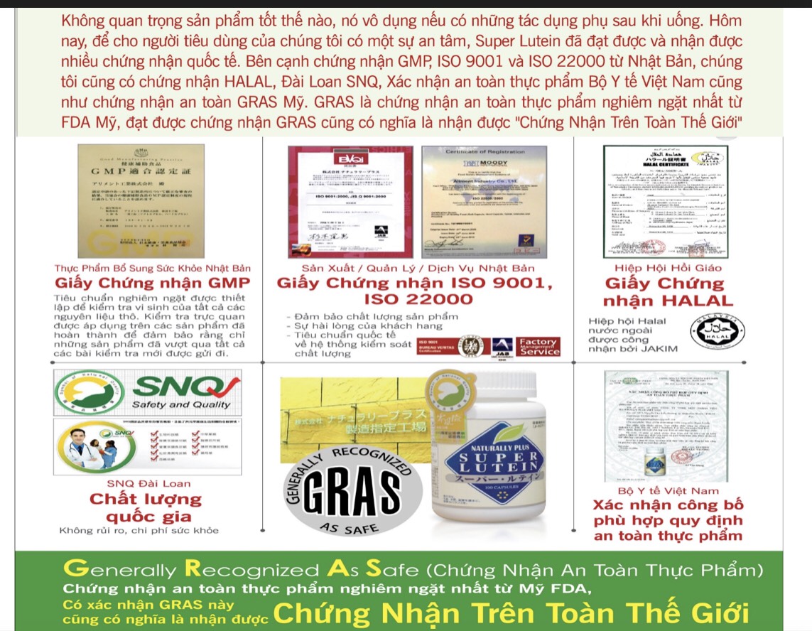 Điều đặc biệt là, Super Lutein. Super Lutein Mirto Plus đã được khuyến cáo bởi Hiệp hội y tế dự phòng Nhật Bản cho Bệnh người lớn tuổi. Hiệp hội này gồm 6.600 bác sĩ. Trong 20 năm qua, có hơn 20.000 sản phẩm được cử đi dự thi hàng năm. Tuy nhiên, chỉ có 1 sản phẩm đã được đề nghị hàng năm. Cho đến nay ,chỉ có 20 sản phẩm trên được đề nghị , Super Lutein là 1 trong số đó. Những sản phẩm bình thường không thể nhận được chứng chỉ, Tất cả đều có văn bằng chứng nhận.