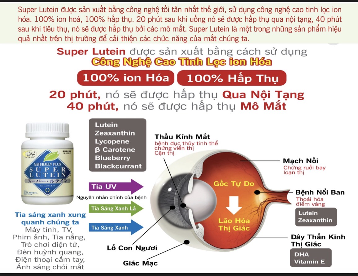 Super Lutein được sản xuất bằng công nghệ tối tân nhất thế giới, sử dụng công nghệ cao tinh lọc ion hoá, 100% ion hoá, 100% hấp thụ, 20 phút sau khi uống nó sẽ được hấp thụ qua nội tạng, 40 phút sau khi tiêu thụ Super Lutein sẽ được hấp thụ bởi các mô mắt.