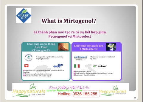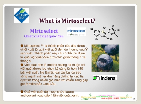 ⦿ Mirtoselect ™ được chiết xuất từ quả Bilberry ( quả Nham lê) được INDENA của ý Chiết xuất độc quyền trên thế giới. Được lựa chọn cẩn thận từ hơn 150 loài cây việt quất. Đây là loại cây bụi có hoa quả có sức sống mạnh mẽ trong những thời tiết khắc nghiệp ở vùng Bắc Âu.