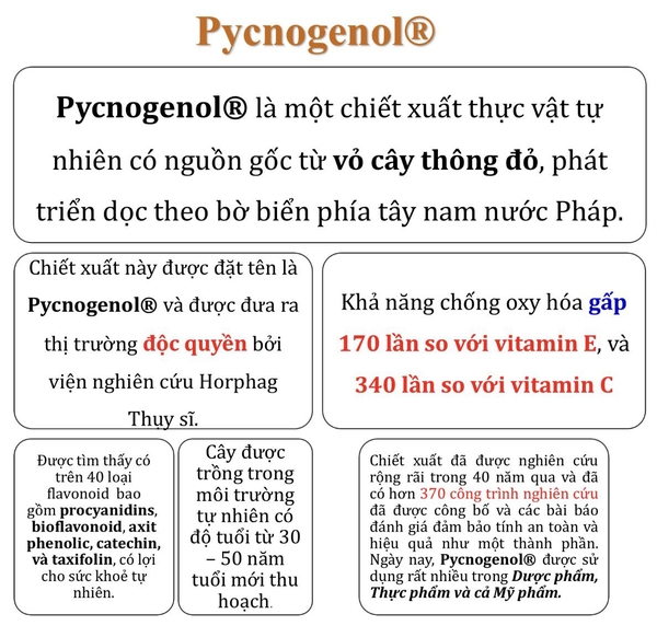 - Pycnogenol® là một thành phần tự nhiên có nguồn gốc thực vật, được chiết xuất từ vỏ cây thông biển 30-50 tuổi ở Pháp. Thành phầnchiết xuất này được đặt tên là Pycnogenol® và được Viện Nghiên Cứu Horphag bán ra thị trường. Những nghiên cứu về Pycnogenol® vẫn được tiếp tục tiến hành cho đến ngày nay.