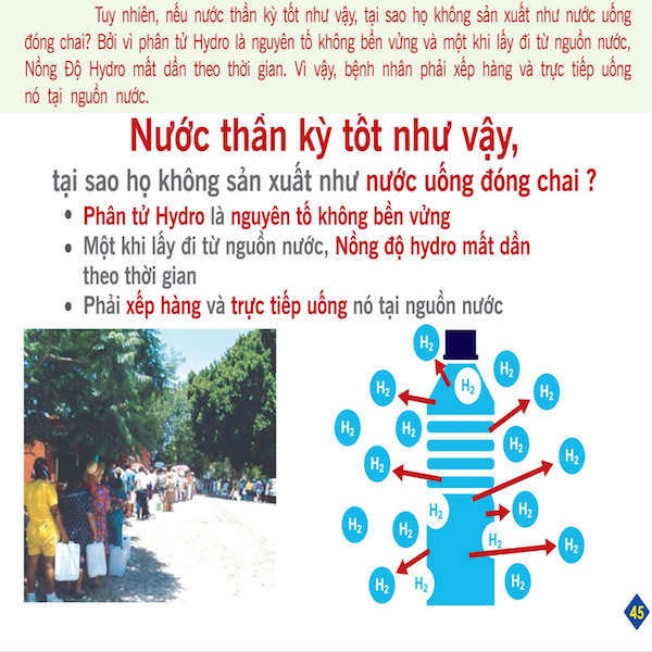 C. Nước thần kỳ tốt như vậy, tại sao không sản xuất như nước uống đóng chai?