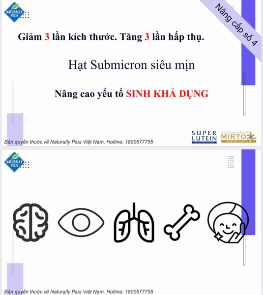 Naturally PLus còn hợp tác với những nhà cung cấp nguyên liệu khác như Riken Vitamin, nơi chiết xuất phẩm màu thực phẩm từ quả cây dành dành ở Đài Loan. Công đoạn cuối cùng, công ty Aliment Industry ở Nhật Bản làm ra sản phẩm Super lutein đã đạt và nhận được nhiều chứng nhận quốc tế: hoàn thiện từ những nguyên liệu trên đạt tiêu chuẩn GMP, ISO 22000 từ Nhật Bản, Xác nhận an toàn thực phẩm Bộ Y Tế Việt Nam và con dấu CRAS ( Genarally Recognized As Safe: chứng nhận an toàn thực phẩm ) nghiêm ngặt nhất từ Mỹ FDA, Có xác nhận CRAS này cũng có nghĩa là nhận được “ chứng nhận trên toàn thế giới” vì đã được kiểm định an toàn mọi đối đối tượng kể cả phụ nữ có thai .![]()
