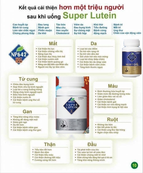 - Super Lutein là một thực phẩm chức năng có chứa 6 loại sắc tố hữu cơ cơ bản, trong 1 sản phẩm với công nghệ tinh lọc ion cho phép tác động sâu tới từng tế bào và điểm vàng con mắt mà không có sản phẩm có thể tác động được.