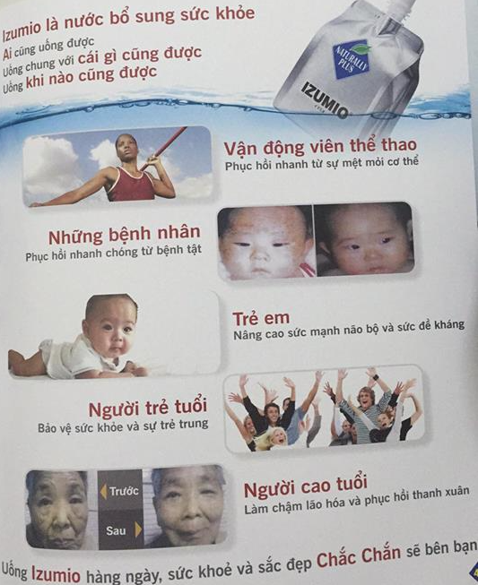 Izumio là nước bổ sung sức khỏe. Bất cứ ai cũng uống được, uống chung với cái gì cũng được và uống khi nào cũng được. Izumio thích hợp nhất cho vận động viên thể thao, người mong muốn hồi phục nhanh từ sự mệt mỏi cơ thể, Những bệnh nhân muốn phục hồi nhanh chóng từ những khổ đau của bệnh tật; Tăng cường sức mạnh não bộ cũng như khả năng miễn dịch của trẻ em; Người trẻ, ai cũng muốn bảo vệ sức khỏe và sự trẻ trung của họ và người lớn tuổi, những người muốn trì hoãn sự lão hóa và phục hồi sự trẻ trung. Uống Izumio hàng ngày, sức khỏe. và sắc đẹp chắc chắn sẽ bên bạn. Nào , chúng ta bắt đầu uống ngay từ bây giờ.