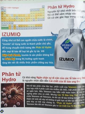 “ Phân tử Hydrogen”” là các nguyên tử nhỏ nhất trên thế giới. Nó có thể xâm nhập vào tất cả các góc hẹp trong cơ thể. Cũng như cơ thể con người chứa nước là chính, “ Izumio” sử dụng nước là thành phần chủ yếu, để trung chuyển khối lượng lớn Phẩn tử hydro đến mọi tế bào để loại bỏ gốc tự do. Với hiệu quả hanh của nó, Izumio là sản phẩm không thể đánh bại trong thị trường cạnh tranh rộng lớn với rất nhiều thực phẩm chống Oxy hóa. Theo báo cáo của nhiều chuyên gia, “ Phân tử Hydro”” cũng có khả năng ngăn chặn sự di căn của các tế bào ung thư và là nguyên nhân dẫn đến cái chết của tế bào ung thư.